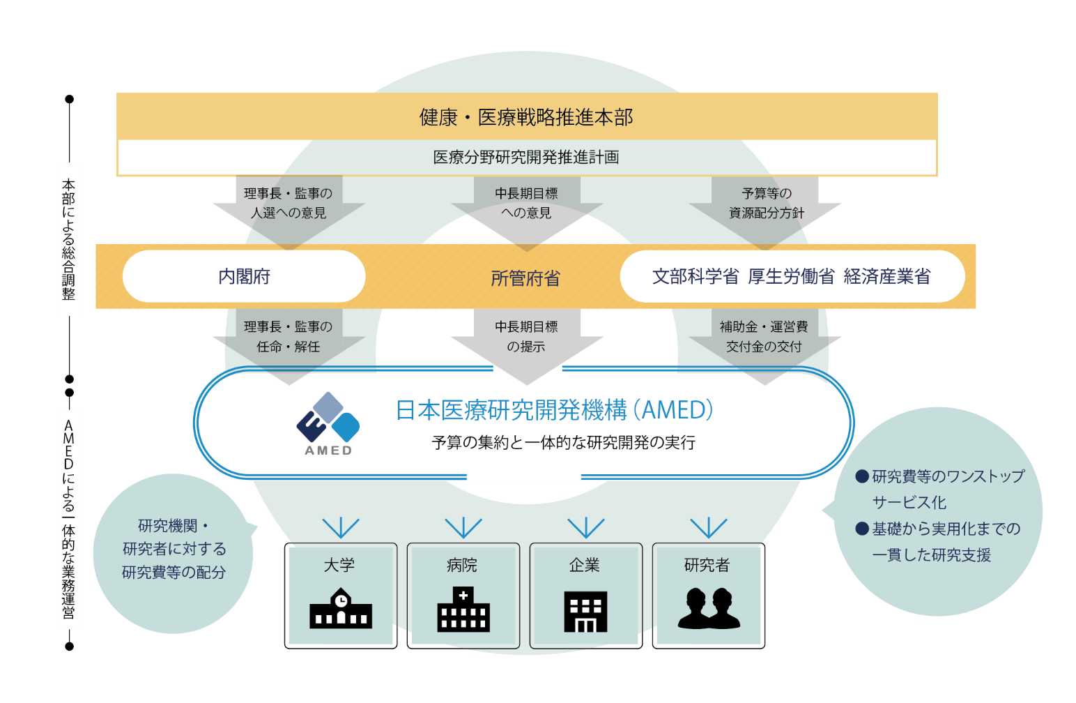 AMED was established in fiscal 2015. Having entered our eleventh year, we play a central role in supporting and fostering the necessary environment for research and development (R&D) in the medical field toward fulfilling our mission of “bringing research outcomes in the medical field to practical application and delivering them to patients and their families as quickly as possible.” Under the Third Medium- to Long-Term Plan that began in fiscal 2025, we are promoting R&D through eight integrated projects (PJ1?8) revolving around drug discovery and therapeutic approaches.